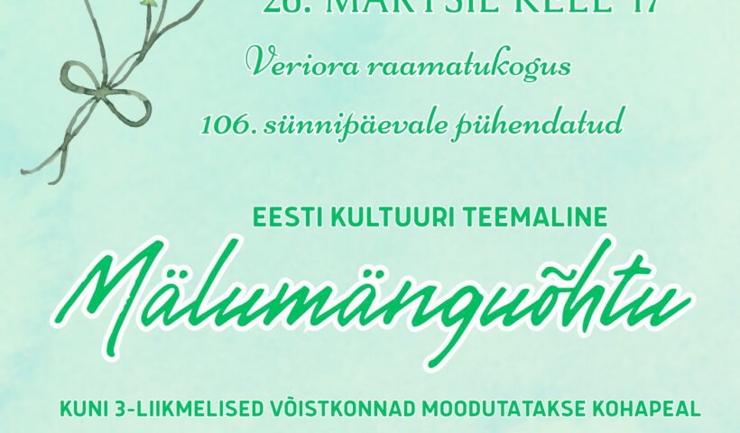 Veriora raamatukogu Mälumänguõhtu Veriora raamatukogus Jane Arusoo 26. veebr. 2026Pilt Loe edasi... Mälumänguõhtu Veriora raamatukogus
