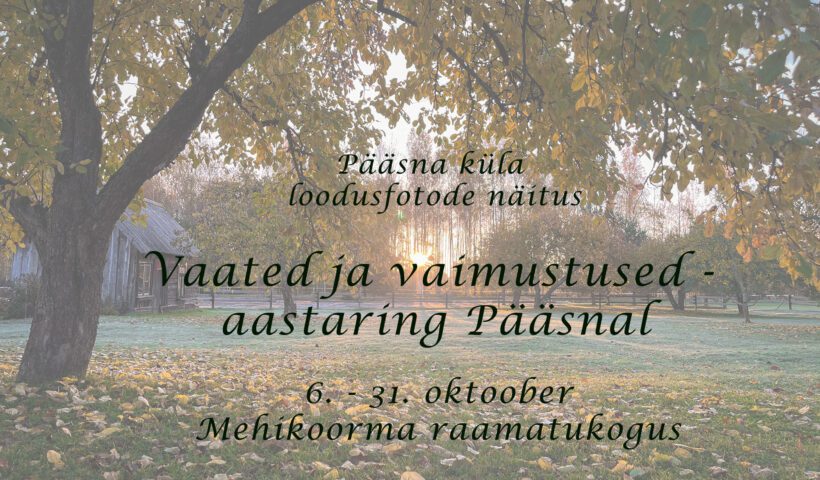 Mehikoorma raamatukogu Näitus Pääsna küla loodusfotode näitus “Vaated ja vaimustused-aastaring Pääsnal” Mehikoorma raamatukogus Jane Arusoo 3. okt. 2025Pilt Loe edasi... Pääsna küla loodusfotode näitus “Vaated ja vaimustused-aastaring Pääsnal” Mehikoorma raamatukogus